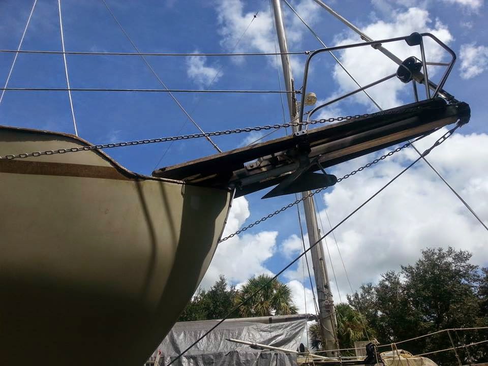 Today, that is no longer true! Today, thanks to two new friends, John and Don, we wrestled the rudder back into place and now, she is not only a tall ship, but I can steer her. (Now if it will just quit raining in south Florida, I might find a star to steer her by).